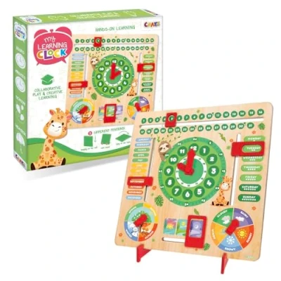 ⏰ COMPLETE LEARNING CLOCK: Wooden teaching clock time for kids with calendar, seasons, days and months, designed as an interactive clock for early development and preschool learning resources. 🎁 PERFECT GIFT IDEA: This telling time clock kids set with cute animals is a clever clock kids love, making it an ideal gift for birthdays or school readiness; fun and educational for ages 5+. 🐻 EARLY EDUCATION FUN: Learn to tell the time clock with colourful dials, arrows and boxes; children discover days, weather, months and seasons in a playful way using engaging preschool learning resources. 🌦️ INTERACTIVE TEACHING CLOCK: Helps kids connect colours with seasons, learn weekdays and weekends, and build confidence; a time learning clock and kids tell time clock for early development. 🪵 VERSATILE DESIGN: Use freestanding with detachable stand, on a table or wall mounted; durable wooden teaching clocks for children that support everyday learning and time routines., Manufacturer: CRAZE