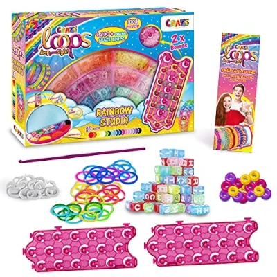 CRAZE Loops Rainbow Studio XXL loom bands set: the Loops Rainbow Studio contains 1,300 CRAZE loops in 18 different colours, letter beads, clasps, large storage box, 2 latch boards and a crochet hook made of aluminium. One, two, three - and off you go. Instructions (English language not guaranteed) provide help with the first steps 100% silicone in the highest CRAZE premium quality: so that the rubber bands do not pull on the skin and the creative works of art are beautifully elastic, we have made our CRAZE LOOPS not made of PVC, but made from 100% silicone. The highlight: our Loops loom bands can be used again and again even after repeated knotting, as they do not become brittle or brittle Being creative is in our blood - and from the beginning! The whole family can participate in making bracelets, hair accessories, necklaces, rings, Christmas decorations and much more. At CRAZE we have also created many great accessories and cool sets for our LOOPS that include everything you need to get started right away The CRAZE Loops Rainbow Studio is the perfect gift for girls and boys – whether as a small gift, as a party bag for Christmas, birthday, communion, etc. The CRAZE Loops Rainbow Kit is suitable for any occasion At CRAZE we want to provide children with fun and safe toys. The original CRAZE Loops is safe to use, without toxins or dangerous ingredients for children. Visit our Amazon store and discover all our products, Manufacturer: CRAZE