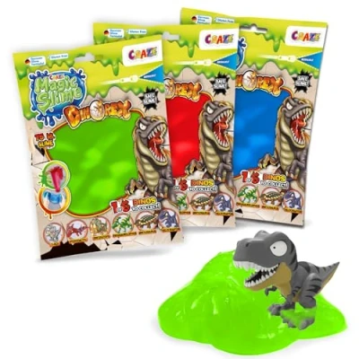 SLIME FOR KIDS Unbox 6 bags of magical fun! Get ready for hours of gooey, stretchy fun with our CRAZE Kids Slime Pack! Each bag contains 75ml of pre-made, non-toxic slime, and dinosaur figure, perfect for kids of all ages. A creative alternative to play dough PERFECT GIFT FOR KIDS! Colourful, squishy fun with creative slime for children! Exciting slime kits for boys and girls encourage hands-on play and imagination. A must-have for birthdays, Christmas and everyday gifts for boys and girls. A clever alternative to playdough DURABLE SLIME After playing with MAGIC SLIME, put it back into the resealable bag.. This bag is fully airtight and will preserve its texture. If you want a slime less liquid you can pour it into a sufficiently large plate and let it dry to reach the desired texture SAFE & FUN Made with a German formula, our slime is rigorously tested to be free of BPA, gluten, and other harmful ingredients. Let your child explore the amazing world of slime with confidence, knowing they're playing safely RANDOM COLOURS FOR SURPRISE & DELIGHT! Each pack includes 6 bags of slime in 6 random colours, offering a vibrant and exciting sensory experience. The element of surprise adds to the fun, making every play session unique, Manufacturer: CRAZE