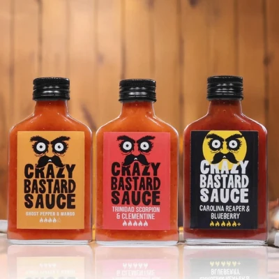 Turn up the heat with the Crazy Bastard Hottest Sauce Set – a powerful trio of fiery sauces crafted for serious chilli enthusiasts. This gift set features three of the most intense sauces in the Crazy Bastard range (excluding the fermented Superhot series), each packed into a 100ml bottle and bursting with bold, natural heat. Whether you're drizzling, dipping, or daring your friends, these sauces promise to deliver full-on flavour with every fiery drop. Made using high-quality ingredients and free from artificial flavours, sugars, or preservatives, these sauces are as clean as they are hot. They’re 100% vegan, making them a guilt-free way to elevate your favourite dishes with complex chilli profiles and mouth-watering spice. Ideal for adding serious kick to everything from tacos and wings to marinades and stir-fries. Perfect as a gift for heat-seeking foodies or a thrilling addition to your own hot sauce collection, the Crazy Bastard Hottest 3 Sauce Gift Set doesn’t just bring the burn – it brings rich, layered taste too. Order now and unleash the ultimate spicy experience in your kitchen or at your next BBQ.