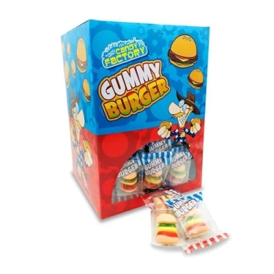 FRUITY FUN: Indulge in Crazy Candy Factory mini gummy burgers, individually wrapped for novelty value and retro sweetness BULK VALUE: Perfectly portioned and individually wrapped, this pack of 100 is ideal for party bags, event giveaways, novelty collections, or simply adding a fun twist to your candy stash KID-FRIENDLY: Kids adore these American-style candy treats; shaped like mini burgers, they are fun to eat and enjoy EDIBLE NOVELTY: Add a touch of whimsy to any gathering with these delightful fruit-flavoured gummy burger sweets- a flavourful trip down memory lane! VERSATILE TREATS : Suitable for parties, party favours or as gifts - these Crazy Candy Factory sweets are a tasty treat that everyone can enjoy