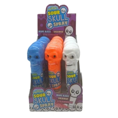 FRUIT FLAVOUR SELECTION: A tangy combination of raspberry and orange flavours in a sour candy liquid, designed to delight adventurous taste buds FUN HALLOWEEN TREAT: Ideal for themed parties or spooky celebrations, the skull-shaped bottles offer a unique seasonal presentation CONVENIENT: Each 50 ml spray is individually bottled for easy sharing, gifting, or retail use MIXED ASSORTMENT: Includes an array of flavours for a playful pick ‘n’ mix experience perfect for children and adults alike PREMIUM QUALITY: Manufactured to high standards to ensure great taste, vibrant colour, and consistency in every spray