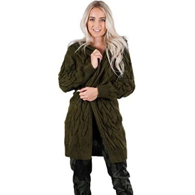 Crazy Girls Womens Chunky Knit Long Cardigan, Khaki, ML (UK 12 14)