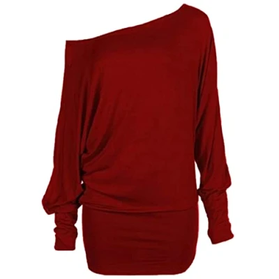 Crazy Girls Womens Long Sleeve One Off Shoulder Plain Baggy Batwing Top UK8 24, Wine, SM (UK 8 10)