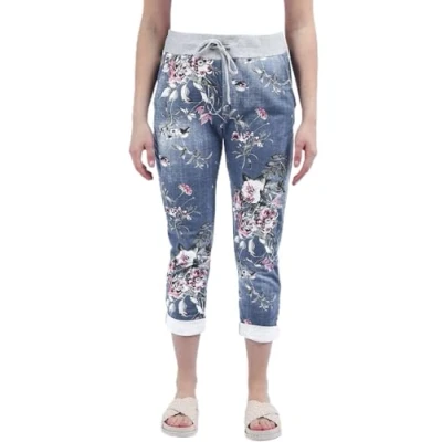 Crazy Girls Womens Plain Italian Floral Trousers, Denim Blue Floral, SM (UK 8 10)