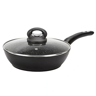 Granity sauté pan diam. 24 cm H 6.5 cm - Black exterior and black speckled stone effect interior and grainy, ideal for searing, grilling or roasting. Suitable for gas, electric, ceramic and induction cookers. PFOA-free non-stick coating for healthier cooking and easy cleaning Granity sauté pan with reinforced forged aluminium body and a conductive bottom thicker than the skirt for better thermal shock resistance Durable thermo plastic handle and stainless steel insert for a timeless design. A steamed glass lid to prevent splashes when cooking completes the sauté pan.