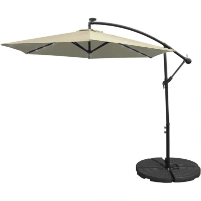 General description Get summer ready with this beautiful LED cantilever parasol. Stylish and practical, this stunning addition to your garden provides excellent UV protection with high-quality 160g polyester. Combining traditional workmanship with modern aesthetics, this cream parasol will perfectly complement your surroundings. The crank winding mechanism allows for quick setup, and it can be tilted to the perfect angle for optimal shade. With a full 360-degree rotation, it offers easy shading control throughout the day. The hanging style keeps the stand out of the way, maximizing your shaded area. A discreet vent at the top of the canopy aids airflow and stability by reducing wind pressure. Each rib is adorned with 4 solar-powered cool white LED lights, ensuring your summer evenings remain illuminated. A built-in on/off switch allows for easy lighting control. Technical specifications Colour: Cream Weight: 11.9kg Frame Material: Powder coated carbon steel Parasol Cover Material: