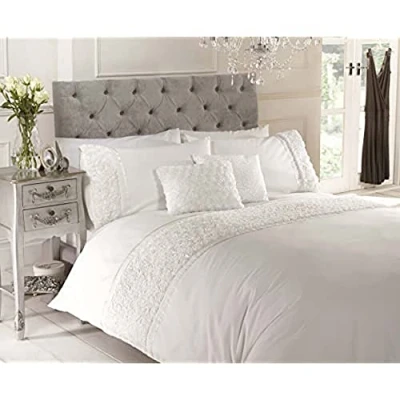 Cream Double Duvet Quilt Cover Bed Set Bedding Raised Rose & Ribbon Polycotton