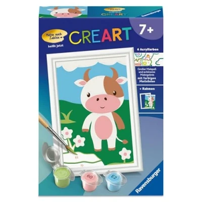 Craft set for children: with this creative painting set from Ravensburger paint by numbers from 7 years, the little ones can get started right out of the box and create real works of art Creative activity for children: the coloured motif lines make minor mistakes invisible, make colouring easier and thus ensure a more beautiful end result Great colouring fun with children's favourite motifs: the cute cow makes children's eyes light up and is therefore the ideal gift for small and large artists. KIDS ROOM DECOR Thanks to the included frame, paint by numbers is also perfect as a decoration for the nursery, so your kids can be proud of their artwork for years to come The painting set contains 6 acrylic paints in resealable, numbered bowls, a sturdy painting board in the format 9.50 cm x 13.20 cm, a matching frame and a brush. The colours dry quickly, are water-based, odourless and do not require a brush cleaner, Manufacturer: Ravensburger