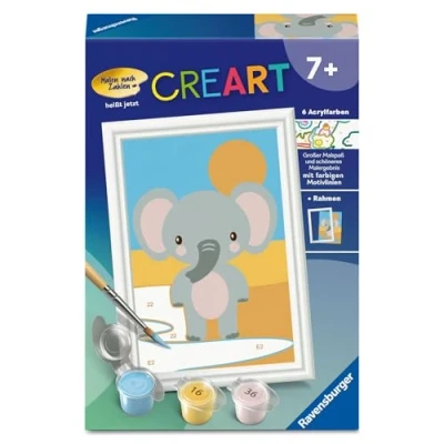 Craft set for children: with this creative painting set from Ravensburger paint by numbers from 7 years, the little ones can get started right out of the box and create real works of art Creative activity for children: the coloured motif lines make minor mistakes invisible, make colouring easier and thus ensure a more beautiful end result Great colouring fun with children's favourite motifs: the cute elephant makes children's eyes light up and is therefore the ideal gift for small and large artists. KIDS ROOM DECOR Thanks to the included frame, paint by numbers is also perfect as a decoration for the nursery, so your kids can be proud of their artwork for years to come The painting set contains 6 acrylic paints in resealable, numbered bowls, a sturdy painting board in the format 9.50 cm x 13.20 cm, a matching frame and a brush. The colours dry quickly, are water-based, odourless and do not require a brush cleaner, Manufacturer: Ravensburger