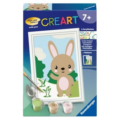 Craft set for children: with this creative painting set from Ravensburger paint by numbers from 7 years, the little ones can get started right out of the box and create real works of art Creative activity for children: the coloured motif lines make minor mistakes invisible, make colouring easier and thus ensure a more beautiful end result Great colouring fun with children's favourite motifs: the cute rabbit makes children's eyes light up and is therefore the ideal gift for small and large artists. KIDS ROOM DECOR Thanks to the included frame, paint by numbers is also perfect as a decoration for the nursery, so your kids can be proud of their artwork for years to come The painting set contains 6 acrylic paints in resealable, numbered bowls, a sturdy painting board in the format 9.50 cm x 13.20 cm, a matching frame and a brush. The colours dry quickly, are water-based, odourless and do not require a brush cleaner, Manufacturer: Ravensburger