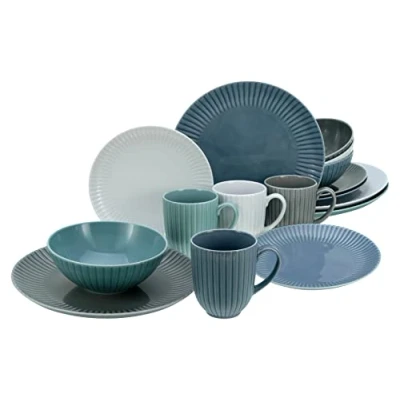 Here you receive a beautiful, 16-Part combination service from the finest European production in the following composition: - 4 dinner Plates flat 27 cm - 4 plates flat 20, 5 cm - 4 Cups 32 cl - 4 multipurpose trays 17 cm the porcelain tableware presents itself on the basis of the latest coupe form in the trendy design mix Nostalgia, movement and lightness. The coloured glazes in white, stone, petrol and blue, which are not covering colours, set the relief elegantly in scene. The ideal tableware for the discerning connoisseur!