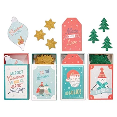 Use – Each matchbox has its own unique design and is filled with glitter shapes or gift tags, which are paramount for your festive craft projects and creations. After all what is A festive craft project without a little glitter and sparkle? Ideal – these glitter shapes and gift tags can be used for card making, scrapbooking, gift wrapping, paper crafts, invitations, table decorations and more. The Creative design possibilities are endless Personalise – ensure that presents are received by the correct recipient by popping a tag on it. You will never forget who a gift is for again Gift – once you have used the contents, simply fill These festive matchboxes with delicious festive treats to create the perfect present Contents – The pack contains 4 match boxes. 2 are filled with gift tags and the other 2 are filled glitter shapes; gold glitter stars and green glitter trees