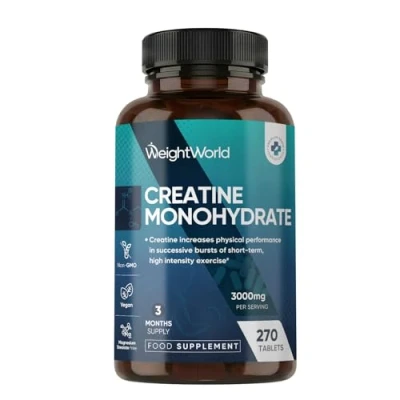 270 TABLETS - 3 MONTHS SUPPLY: Each bottle contains 270 creatine monohydrate tablets, providing a whole 3-month supply. Designed for convenience, these creatine tablets offer a mess-free way to take creatine without any measuring or mixing required. Whether at home, at the gym, or on the go, they make creatine intake easy, turning it into a hassle-free addition to daily life. STAY READY FOR EVERY REP: Creatine is a naturally occurring compound found in small amounts in certain foods like meat and fish, and it can also be produced by the internal system from amino acids. Daily creatine consumption can enhance the effect of resistance training on muscle strength in adults over the age of 55. Creatine increases physical performance in successive bursts of short-term, high intensity exercise (EFSA). VEGAN-FRIENDLY & MICRONISED: Each serving delivers 3372mg of creatine monohydrate, providing 3000mg of active creatine. This supplement is both vegan-friendly and keto-friendly, making it suitable for a wide range of dietary preferences and lifestyles. These creatine tablets are micronised to offer easier absorption. DESIGNED TO FIT INTO DAILY ROUTINES: Manufactured in a GMP-approved facility, these creatine monohydrate powder tablets are made with non-GMO ingredients. Moreover, these creatine monohydrate tablets are magnesium stearate-free and gluten-free. Formulated for both pre and post-workout routines, these creatine pills are designed to align with the daily regime. THE JOURNEY OF WEIGHTWORLD: Born from a passion for food supplements, WeightWorld has been growing since 2006. With nearly two decades of experience, the brand offers a wide range of products, including vitamins, minerals, plant-based supplements, devices, and more. Now reaching multiple countries, the focus remains on developing products that evolve with changing needs while staying true to the values that started it all.