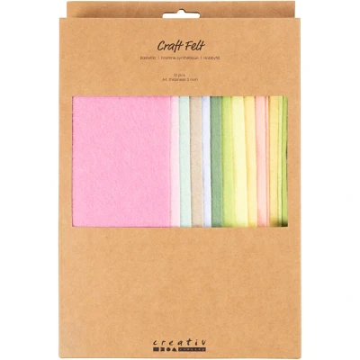 Creativ Craft Felt Sheets A4 – 2mm Pastel Colours (210 x 297mm, Pack of 10). Create soft, colourful craft projects with Creativ A4 Craft Felt Sheets in beautiful pastel shades. Made from 100% polyester and measuring 2mm thick, these high-quality felt sheets are perfect for cutting, sewing and gluing. Each pack contains 10 A4 sheets (210 x 297mm) in inspiring pastel colour combinations, ideal for a wide range of creative projects.. Product Features:. A4 Size (210 x 297mm): Convenient sheet size for detailed craft work.. 2mm Thickness: Durable, sturdy and easy to handle.. Soft Pastel Colours: Gentle, on-trend shades perfect for seasonal and decorative crafts.. Pack of 10 Sheets: Great value for multiple projects.. 100% Polyester Felt: Strong, flexible and long-lasting material.. Non-Fraying Edges: Clean cuts without fraying for a neat, professional finish.. Easy to Cut, Sew & Glue: Suitable for children, beginners and experienced crafters.. Perfect For:. Christmas, Easter and spring decorations. Handmade toys and teddy bears. Appliqué and sewing projects. Nursery décor and pastel-themed crafts. School projects and family craft activities. This soft pastel craft felt is easy to work with and delivers beautiful results every time. Whether you're creating seasonal decorations, sewing handmade gifts or enjoying craft time with children, Creativ
