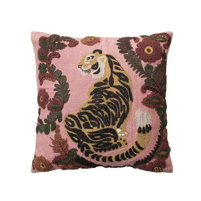 Creative Co op, Multicolor Embroidered Tiger and Flowers Cotton Slub Pillow