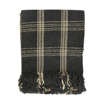 Creative Co Op Plaid Black & Tan Fringed Woven Cotton Blend Throw 60 inch x50