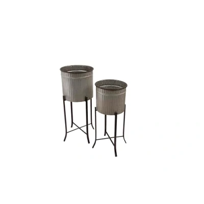 This rustic set of metal planters features a classic, corrugated texture and attached, sleek metal stands Display in a living space of any style from country to cottagecore Holds 10 inch and 12 inch diameter pots Made from 100% iron Planters measure 13.5 inches diameter x 30.75 inches H, 11.75 inches diameter x 27 inches H
