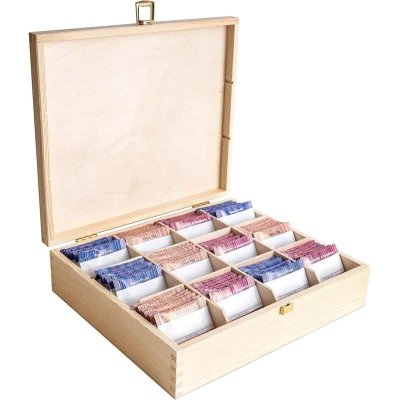 PERFECT SIZE – With external dimensions of 29 x 25 x 7.5 cm and removable compartments measuring 7 x 5 cm, this box is ideal for storing tea bags, coffee or small items such as jewellery. It adds a decorative touch to your kitchen, office, bedroom or even a restaurant. ELEGANT DESIGN – This tea box combines functionality and aesthetics. Its timeless, vintage-inspired design is perfect for those who appreciate classic kitchen accessories. It also makes an ideal gift for Christmas, birthdays or any special occasion. STRONG AND DURABLE – Carefully crafted, this product combines refined design, high-quality materials and years of manufacturing experience. It is built to be sturdy, reliable and long-lasting, ensuring everyday use over time. NATURAL WOOD – Made from pine wood, this tea box blends seamlessly into any kitchen style, offering both elegance and practicality. Its natural material ensures strength and durability. MADE IN THE EU – Our products are manufactured in the European