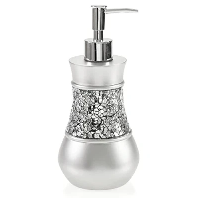 Touch Of Class: This Silver Soap Dispenser Sports Captivating elegant Silver Color With modern Mosaic Glass Pattern, And Elegant Shape To Spruce Up Your bathroom Decor. Designed To Last: Our bathroom soap dispenser Is Made Using Sturdy Long Lasting High-grade Resin That Weathers The Humid Condition Of Your Bathroom Without The Risk Of Rusting Or Cracking, Unlike Regular Soap Dispensers That Easily Clog And Jam, And Is That Easy To Clean. Extra Smooth Operation: Our Soap Dispenser Pump Comes With A sturdy Pump For Reliably Smooth Dispensing And Extra Durability; The liquid soap dispenser Has A Wide Opening Which Makes Refilling The Soap Bottle A Breeze. Saves On Space: Whatever The Size Of Your Bathroom, Measuring 3.75" (W) X 3.75" (L) X 8.25" (H) This Silver Colored lotion dispenser with pump Will Comfortably Fit Your Sink Without Wasting Much Of Your Space. Our Are Perfectly-sized To Fit Most Sinks And Vanities And Are Easy To Refill. Unique Gift Idea: This modern soap dispenser Makes A Great Birthday, Or Wedding Present For Both Men And Women. Bundle The Bathroom Soap Dispenser With Other Bathroom Accessories From The silver colored Collection To Create A Truly Memorable Gift Set! Click ‘add To Cart’ Now!, Manufacturer: Creative Scents
