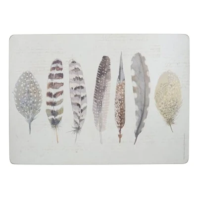 PROTECT SURFACES and bring the natural charm of the outdoors to mealtimes with these feather-themed placemats FEATHER DESIGN: it features 7 different types of bird feather, showing off each delicate pattern and texture HEAT-RESISTANT TO 120°C: these placemats are ideal for serving dishes and plates. The cork back protects from heat and scratches MATCH WITH: medium sized mats (C000285) and coasters (C000286) to protect your surfaces from smaller items like bowls and mugs INCLUDES: 4 x cork placemats. Each measures 40 x 29 cm (15½" x 11½") and 5 mm (¼") thick. Wipe clean only
