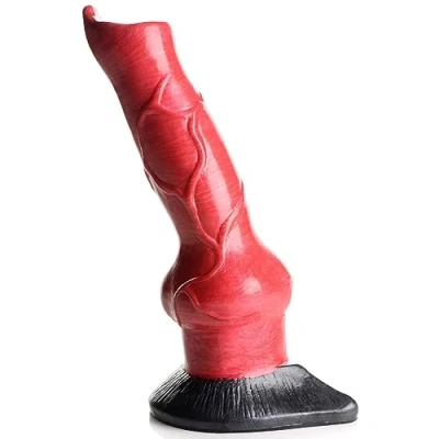 Fantasy Dildo: Make your fantasies come true with this devilish red, curved hell-hound dildo! Enjoy the realistic upward curve, the thick veins, the bulbous glands and the concave tip! Put a costume together or use your imagination and play out your favorite fantasy scene! Suction Cup Base: Enjoy the wide, suction cup base of this dildo. Simply press firmly on any flat surface and enjoy riding it hands-free! Harness Compatible: The wide, flanged base is compatible with most strapon harnesses so you can wear it and play the role of reptilian conqueror! Premium Silicone: Made of body-safe, phthalate-free, premium silicone Measurements: Overall length: 7.5 inches, Insertable length: 6.5 inches, Narrowest insertable diameter: 1.3 inches, Widest insertable diameter: 2.6 inches