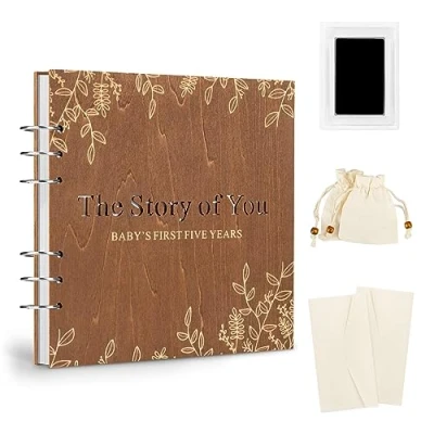 Wooden Baby Milestone Book with Detailed Craftsmanship: Crafted with a delicate wooden cover, Creawoo wooden baby book keepsake box offers a unique and elegant way to record the story of your baby boys and girls. Inner pages themed with watercolor design and made with premium paper material, keep baby's precious memories lasting for many years. Capture Entire Baby's Growth Journey: The unisex baby memory book covers every important milestone from pregnancy to age 5. With comprehensive chapters: pre-birth stories, exciting first week, significant first year, favorite things & memorable firsts, and yearly milestones. Ample writing space and photo space for you to collect baby's milestone moments. Personalised Touch with Souvenirs & Letters: The 2 x cotton storage bags allow you to keep little baby's fetal hair, baby teeth, or other small souvenirs. The 2 x thickened special envelopes make you can write heartfelt letters to newborn baby and make it a unique time capsule. These small details make every memory more warm and authentic. Baby Journal Record Book with Thoughtful Designs: Recognizing the beauty of ALL types of families, including LGBTQ, adoptive families, single parents, irrespective of race and religion, ensure everyone's unique story can be told. We attach replaceable pages (Separately Wrapped) for this baby memory album book. Loose leaf coil design easy for you to add, remove, or replace pages. Baby Ink Pad & More Photographic Memories: The attached baby ink pad allows you to save your baby's handprints or footprints for lasting. (Enlarged Size) Consider storing more photographic memories for you, we prepare 5 additional photo album pages. Offer enough photo and writing space for you. Baby Memory Book Set Keepsake Gift: The 5-in-1 baby milestone memory book is encased in a stylish white gift box with magnetic opening design. All of these are carefully packaged in this gift box, not only protects these precious keepsakes but also makes a heartfelt and warm baby shower gift for new parents, mum to be, expecting mums dads. (For Adult Use Only.)