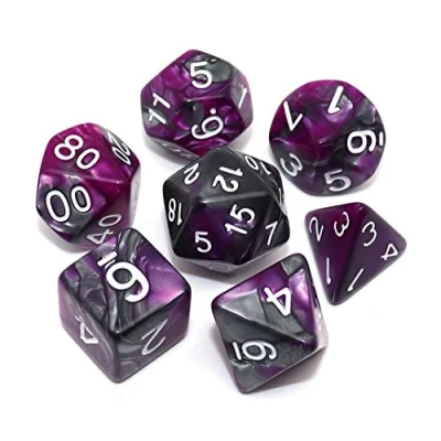 7Pcs Polyhedral DND Dice Set: Silver and purple double color d&d pearl dice, including D2 D12 D1 D% D8 D6 D4 and a dice bag, suitable for your own use or as a gift. Material of Dice: These dices are made from eco-friendly acrylic material, compared with resin dice, the color of acrylic dice is richer, more durable and more economical. Easy to Read: The white numbers on the surface of the dice, using underscoring to differentiate 6 and 9,no visual trouble,so you can focus more on your games. Well Balanced RPG Dice: Using precise dice mold production, no other materials and decorations are added to the dice, to ensure the balance and practicality of the dice., Manufacturer: CREEBUY