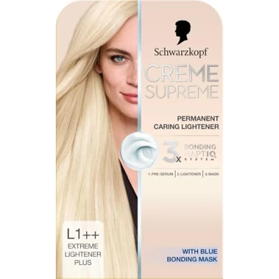Caring lightener: Discover Schwarzkopf Creme Supreme caring lightener with the 3-step bonding system against hair damage - hair serum, colour cream, and blue hair mask Anti-damage protection: This Schwarzkopf caring hair lightening kit does not only protect the hair from damage but cares for the hair before, during, and after lightening Lightening result: Prepare, protect, and strengthen the hair while achieving a beautiful and even lightening result without yellow tones when using this hair lightening kit Our commitment: Creme Supreme hair products use a folding box that is FSC certified***, gloves, paper, and bottles are recyclable Package contents: 1x bonding pre-serum 12ml, 1x applicator bottle with cream developer 60ml, 1x bonding lightening cream (1:1) 60ml, 1x blue bonding mask 50ml, 1 blonde-booster ultra plus, instruction leaflet, and professional gloves