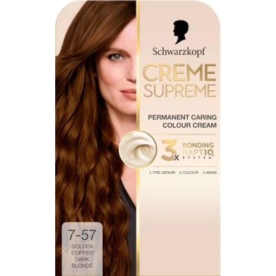 Caring colouration: Discover Schwarzkopf Creme Supreme caring colouration with the 3-step bonding system against hair damage - Bonding Pre-Serum, Bonding Colour Cream, and Bonding Mask. Anti-damage protection: This Schwarzkopf caring hair dye kit does not only protect the hair from damage but cares for the hair before, during, and after colouring Colour result: Prepare, protect, and strengthen the hair while achieving a beautiful and even colour result with 100% grey coverage when using this dark blonde hair dye Our commitment: Creme Supreme hair dyes use a folding box that is FSC certified***, gloves, paper, and bottles are recyclable Package contents: 1x bonding pre-serum 12ml, 1x applicator bottle with cream developer 60ml, 1x bonding colour cream (1:1) 60ml, 1x bonding mask 50ml, instruction leaflet, and professional gloves