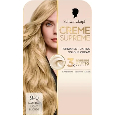 Caring colouration: Discover Schwarzkopf Creme Supreme caring colouration with the 3-step bonding system against hair damage - Bonding Pre-Serum, Bonding Colour Cream, and Bonding Mask. Anti-damage protection: This Schwarzkopf caring hair dye kit does not only protect the hair from damage but cares for the hair before, during, and after colouring Colour result: Prepare, protect, and strengthen the hair while achieving a beautiful and even colour result with 100% grey coverage when using this light blonde hair dye Our commitment: Creme Supreme hair dyes use a folding box that is FSC certified***, gloves, paper, and bottles are recyclable Package contents: 1x bonding pre-serum 12ml, 1x applicator bottle with cream developer 60ml, 1x bonding colour cream (1:1) 60ml, 1x bonding mask 50ml, instruction leaflet, and professional gloves