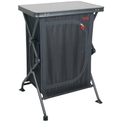 Very sturdy cooking cabinet with 2 compartments. Very easy to set up thanks to the unique fold-out system High-quality and durable materials. Grey aluminium profile. Heat-resistant and waterproof worktop Adjustable legs with stabilizers for stable footing on any surface Table top material: melamine. Frame material: aluminium. Cover material: 100% polyester (400D). Dimensions (L x W x H): 44 x 65 x 89 cm. Packed dimensions (L x W x H): 66 x 60 x 15 cm Weight: 4.8 kg