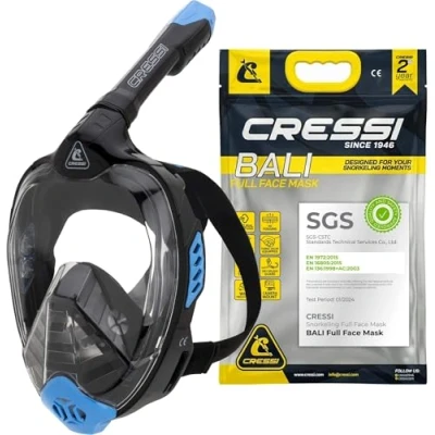 CRESSI Bali Full Face Mask Black/Blue L/XL Unisex Integral Snorkel Mask, Anti Fog Clear Lens, 100% Silicone, Dry with Float Valve, Action Cam Mount, Adjustable Strap, Black/Blue,