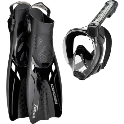 CRESSI Baron+Tonga Combo Black/Black S/M Set Baron Full Face Mask, Wide View, Anti fog System, Easy Breathing+Light Adjustable Tonga Fins, Black/Black,