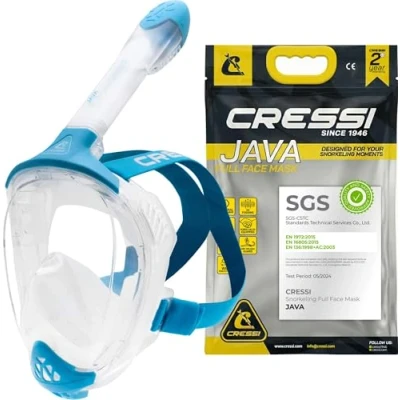 CRESSI Java Full Face Mask Clear/Blue L/XL Unisex Snorkel Mask, Ultra Clear Anti Fog Lens, 100% Silicone, Dry with Safety Valves, Transparent/Blue,