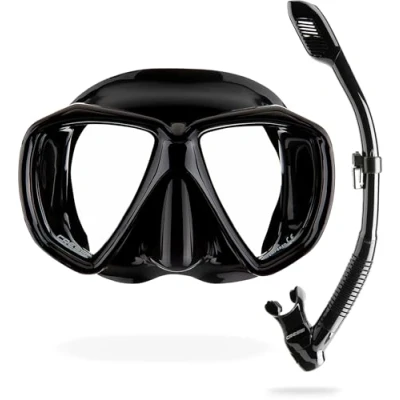High quality set with mask and dry snorkel Very soft silicone, ultra flexible snorkel with dry top valve Micrometric adjustable buckle, purge valve 2-window mask made with Tempered Glass, Low Volume Design, Easy to Clear. Made with Premium High Quality Materials