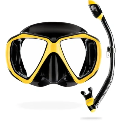 High quality set with mask and dry snorkel Very soft silicone, ultra flexible snorkel with dry top valve Micrometric adjustable buckle, purge valve 2-window mask made with Tempered Glass, Low Volume Design, Easy to Clear. Made with Premium High Quality Materials