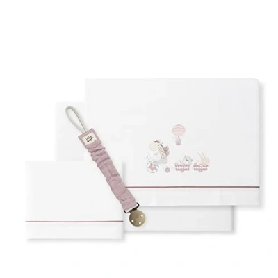 Standard Baby Cot Bed Sheet Set, consisting of 3 pieces Fitted Sheet, Countertop and Pillowcase. Made of 100% cotton, perfect for the spring and summer months being very breathable. Dimensions fitted sheet: 60x120 cm, flat sheet: 106x145 cm and pillowcase: 60x40 cm. Includes a muslin pacifier as a gift. Made in Spain.