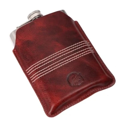 Cricket GIFTS Buffalo Leather Hip Flask 8oz Capacity Red Cover Ideal for Enthusiasts Includes Portable Pouch Unique Stitching, Multicoloured, Metal