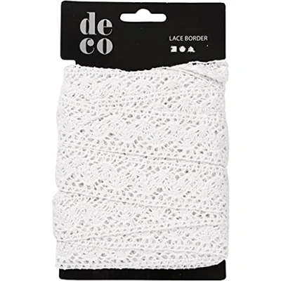 Enhance your sewing and craft projects with this elegant White Crochet Lace Border. Made from 100% cotton, this soft and durable trim measures 30 mm wide and comes on a 10 m roll, making it ideal for both small details and larger decorative finishes.. Material: 100% cotton – soft, breathable, and long-lasting.. Dimensions: 30 mm wide and 10 m long, suitable for multiple projects.. Classic Crochet Design: Adds a handmade, vintage-inspired touch to any creation.. Versatile Use: Perfect for edging garments, quilts, table linens, home décor, and wedding crafts.. Easy Application: Can be sewn, glued, or attached to a variety of fabrics and surfaces.. Whether you’re dressmaking, quilting, or working on DIY décor, this crochet lace trim provides a beautiful finishing touch for timeless and elegant results.