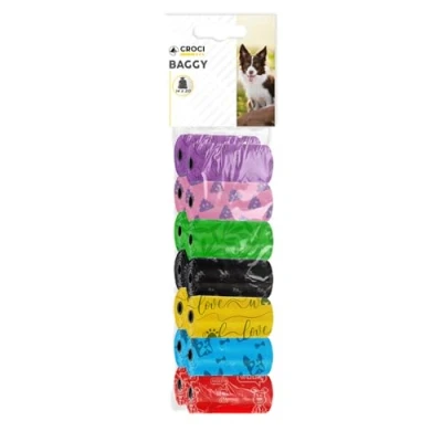Dog dirt bags Made with resistant plastic Different patterns and colors. Available in packs of 14 rolls (20 bags each).