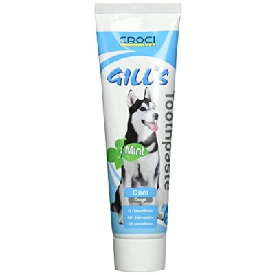 CONTENTS: Gill's Croci toothpaste for dogs with mint flavor, 100g TOOTHPASTE FOR DOGS: Gill's Croci toothpaste is specifically designed for the oral hygiene of your four-legged friends MINT FLAVOUR: thanks to its mint fragrance, Croci Gill's toothpaste helps fight canine bad breath, leaving a pleasant aroma TOOTHPASTE FOR DOGS: Gill's Croci toothpaste is specifically designed for the oral hygiene of your four-legged friends A COMPLETE LINE FOR YOUR PETS: The Gill's Croci line is a family of products designed specifically for the well-being of your animal friends, consisting of toothpastes, shampoos, perfumes, deodorants and moisturizing oils for the coat