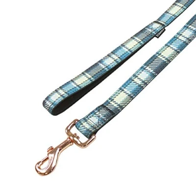 leash for dogs pu textile fabric with tartan pattern matched with nylon webbing. rose gold finishing with handle