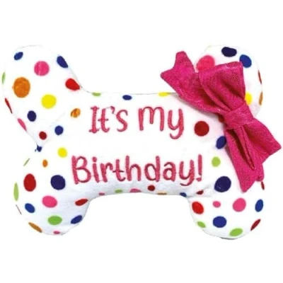 PACKAGE CONTENTS: The package contains a soft bone shaped dog plush. Size: 21.5*19*5cm INTERACTIVE DOG GAME: The plush toy has a built-in whistle that will catch your puppy's attention. CELEBRATE WITH YOUR PET: The bone can be used to take wonderful birthday photos with your pet to share with friends. WARNING: The product is not suitable for aggressive chewing, it is not indestructible and therefore it is best not to leave the game unattended. DISCOVER THE PET'S PARTY LINE: A collection entirely on birthday party theme and contains everything that could make her party delicious!