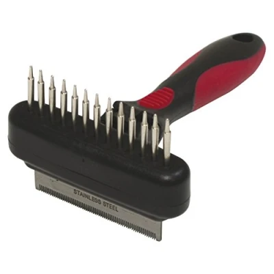 SHEDDING COMB-RAKE 2in1 Handy and easy to use Steel blades perfect to avoid irritation to the skin of the animal. Comb with conical teeth to collect the hair shedding. It removes easily, quickly and effectively the undercoat. Suitable for cats, rough-haired and short-haired dogs and those with abundant undercoat
