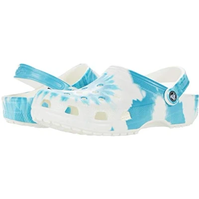 CROCC, CLASSIC TIE DYE CLOG: Timeless, fun and full of peaceful good vibes. The Crocs in bright tie dye for men and women give any style the perfect groovy statement. Iconic comfort: Whether in leisure time or in the city, these slipper clogs are flexible and are made from Croslite material for iconic Crocs comfort. The swivel heel strap provides a secure fit and a trendy look. What size should I buy? These shoes offer a roomy fit, so we recommend ordering one size smaller than the next larger whole size. LIGHTWEIGHT These Crocs for men and women are incredibly lightweight and fun to wear. The flexible material of the shoes is perfect for on the go or just hanging out. BUY WITH CONFIDENCE: High quality and authenticity. -