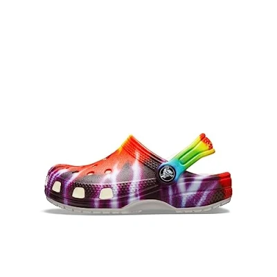 TIE-DYE CROCS FOR KIDS: Timeless, fun and full of peaceful good vibes, the bright tie-dye clogs are the Crocs kids need to add the perfect groovy statement to any style. VERSATILE AND COMFORTABLE: Incredibly light and easy to wear, these girls' and boys' Crocs are created with Croslite foam for Iconic Crocs Comfort. The flexible material is sure to be loved by all. WHAT SIZE SHOULD I BUY: These kids' Crocs offer a roomy fit and we recommend ordering a size up to the next largest whole size. MAKE THEM THEIR OWN: These girls' and boys' Crocs offer a roomy and generous fit that is sure to match every foot. The kids' Crocs can be customized with Jibbitz charms to reflect their own personal flair. CROCS FOR BOYS AND GIRLS: These Crocs for girls and boys are fun to wear and easy to clean using soap and water. The options are endless when you expand your kids' wardrobe with these groovy shoes.