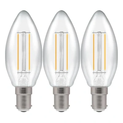 This Crompton Lamps 2.2W LED candle light bulb with a SBC-B15d small bayonet (15mm) fitting is a direct replacement for a traditional 25W light bulb, but has the potential to reduce your home lighting bills and reduce the frequency of needing to replace your light bulbs.LED filament technology is much more energy efficient than traditional light bulb technologies such as incandescent bulbs. This not only helps you save on your energy bills but also helps the environment too.Whereas a traditional light bulb would use 25W to produce 250lm, this LED version uses just 2.2W equating to an energy-efficiency of 113.64lm/W.The beauty of LED filament light bulbs is truly enchanting, seamlessly blending vintage aesthetics with cutting-edge technology. The LED filaments within these bulbs mimic the classic look of incandescent bulbs, casting a glow that exudes nostalgia. Furthermore, LED filament bulbs extend beyond their aesthetic appeal by providing both energy-efficient operation and long-lasting durability, thus positioning them as a sustainable and environmentally friendly lighting choice.With a clear glass finish, this light bulb is designed to recreate the look of traditional incandescent light bulbs.With a long life of 15,000-hours, this LED candle light bulb boasts an incredible 8.2-year lifespan if used for 5-hours a day. These light bulbs dont need to be replaced as often which results in less money spent on replacement bulbs, and less time spent replacing them, too.Combine this superior longevity, negligible maintenance and replacement costs with the LED light bulbs notable energy efficiency then the savings gleaned from each light bulb has the potential to reduce your lighting costs by up to 91%.Cool white (4000K) bulbs produce a cooler, crisp light and are well suited to more stimulating environments. This makes them great in kitchens, workplaces and is also excellent for bathrooms as there is no colour cast; so applying makeup is much easier.Unlike older other energy-saving technologies, LED bulbs light up instantly, with no waiting time to warm up to full brightness.With a size of 35mm diameter with 97mm height, this LED candle light bulb will retrofit directly to any existing SBC-B15d fixture; whether that be smaller domestic light fittings such as chandeliers or wall sconces or up to large-scale commercial installations.
