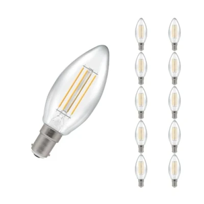 This Crompton Lamps 4.2W LED candle light bulb with a SBC-B15d small bayonet (15mm) fitting is a direct replacement for a traditional 40W light bulb, but has the potential to reduce your home lighting bills and reduce the frequency of needing to replace your light bulbs.LED filament technology is much more energy efficient than traditional light bulb technologies such as incandescent bulbs. This not only helps you save on your energy bills but also helps the environment too.Whereas a traditional light bulb would use 40W to produce 470lm, this LED version uses just 4.2W equating to an energy-efficiency of 111.9lm/W.The beauty of LED filament light bulbs is truly enchanting, seamlessly blending vintage aesthetics with cutting-edge technology. The LED filaments within these bulbs mimic the classic look of incandescent bulbs, casting a glow that exudes nostalgia. Furthermore, LED filament bulbs extend beyond their aesthetic appeal by providing both energy-efficient operation and long-lasting durability, thus positioning them as a sustainable and environmentally friendly lighting choice.With a clear glass finish, this light bulb is designed to recreate the look of traditional incandescent light bulbs.With a long life of 15,000-hours, this LED candle light bulb boasts an incredible 8.2-year lifespan if used for 5-hours a day. These light bulbs dont need to be replaced as often which results in less money spent on replacement bulbs, and less time spent replacing them, too.Combine this superior longevity, negligible maintenance and replacement costs with the LED light bulbs notable energy efficiency then the savings gleaned from each light bulb has the potential to reduce your lighting costs by up to 90%.Cool white (4000K) bulbs produce a cooler, crisp light and are well suited to more stimulating environments. This makes them great in kitchens, workplaces and is also excellent for bathrooms as there is no colour cast; so applying makeup is much easier.Unlike older other energy-saving technologies, LED bulbs light up instantly, with no waiting time to warm up to full brightness.With a size of 35mm diameter with 97mm height, this LED candle light bulb will retrofit directly to any existing SBC-B15d fixture; whether that be smaller domestic light fittings such as chandeliers or wall sconces or up to large-scale commercial installations.