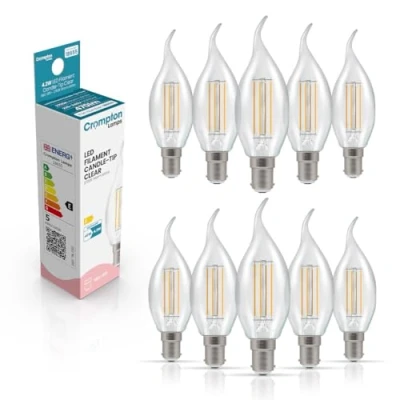 AmazonAdd a touch of elegance with this 10 pack of Crompton Lamps LED filament flame-tip candle light bulbs. With their vintage-inspired bent tip design, they provide stylish and energy-efficient lighting fitting seamlessly into any small bayonet socket. Enjoy energy efficiency with these 4.2W LED bulbs, which provides the same warm white glow as a traditional 40W incandescent light bulb, making it an ideal choice for energy saving light bulbs. This light bulb uses the latest in energy-efficient LED filament technology, reducing energy consumption, while making it the ideal B15 LED bulb for creating ambient lighting in any room. With a long lifespan of up to 15,000 hours, this small bayonet light bulb is a reliable and cost-effective solution for your lighting needs, reducing the frequency of bulb replacements. The clear glass design of these decorative light bulbs enhance their aesthetic appeal, making them a stylish addition to any fixture, whether used as a table lamp, or bulbs for ceiling lights., Weight: 0.3527396192 pounds, Manufacturer: Crompton Lamps